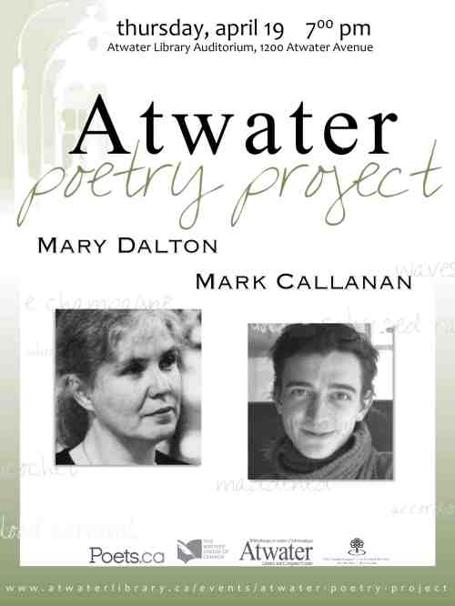 - Thursday, April 19: Atwater Poetry Project (with Mary Dalton) – 7:00 p.m. at the Atwater Library, 1200 Atwater Ave., Montreal